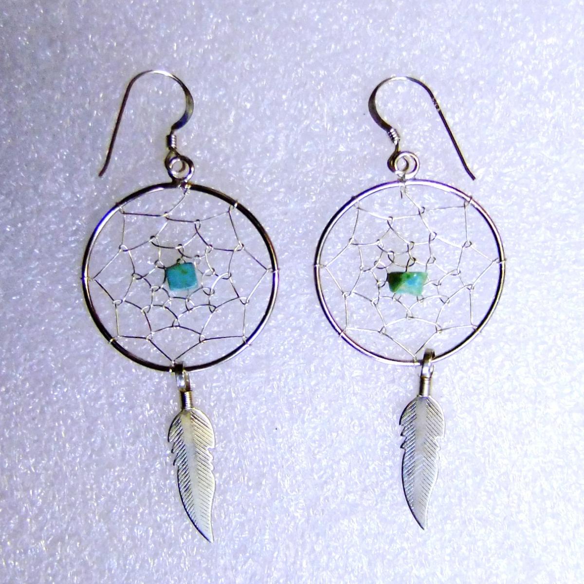 Delightful earrings crafted from sterling silver and turquoise in the design of a dreamcatcher with a trailing feather.
