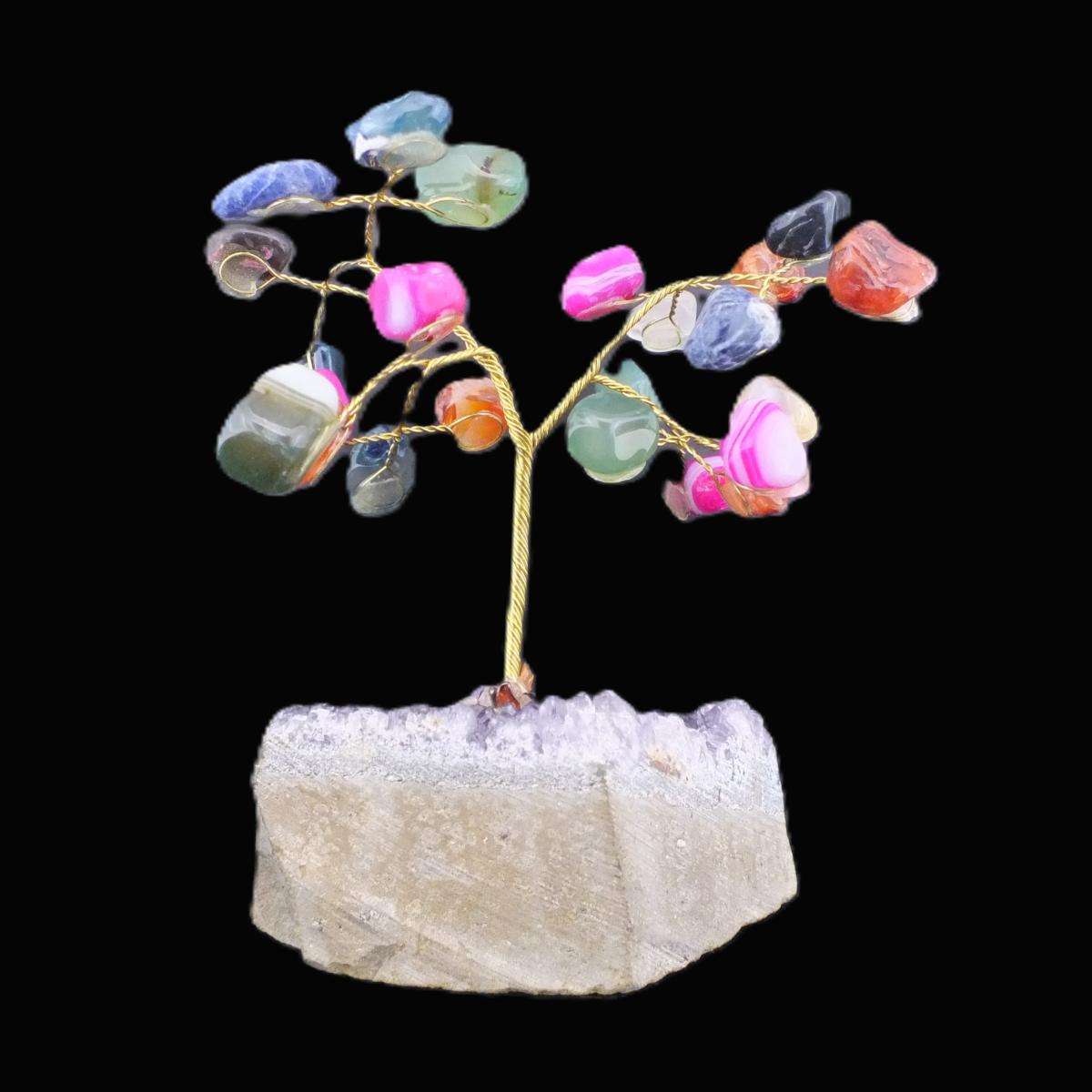 Gem Tree With Amethyst Druze Base, Twisted Wire Trunk & Branches With Multi Coloured Agate Leaves.