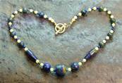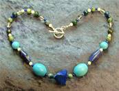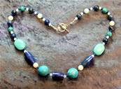 | | THIS NECKLACE FEATURES BEADS IN MALACHITE, LAPIS LAZULI & AZURITE. WEIGHT = 70g. FEATURES A 'T' BAR STYLE CLASP IN STERLING SILVER. |