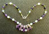 | | THIS NECKLACE FEATURES BEADS IN AMETHYST, FLUORITE, BLUE LACE AGATE & OPALITE. (ALSO FEATURES SOME GLASS BEADS). WEIGHT = 40g. FEATURES A TRIGGER STYLE STYLE CLASP IN STERLING SILVER. |