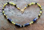 | | THIS NECKLACE FEATURES BEADS IN ANTIQUE LAPIS LAZULI, GREEN AVENTURINE, BLUE TIGERSEYE, LEMON JADE & OPALITE. WEIGHT = 35g. FEATURES A 'T' BAR STYLE CLASP IN STERLING SILVER. |