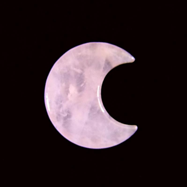 GEMSTONE CRESCENT MOON CARVING IN ROSE QUARTZ.