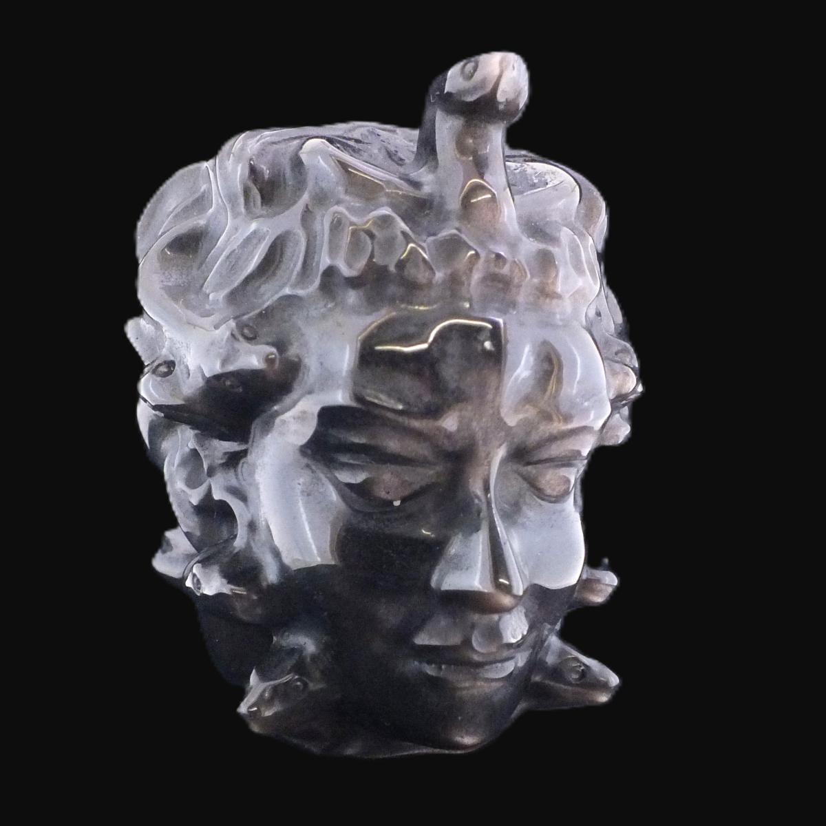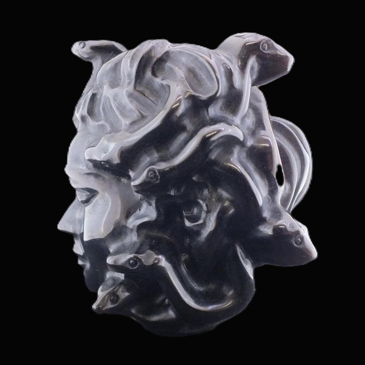 Gemstone Medusa Head Carving In Silver Sheen Obsidian.