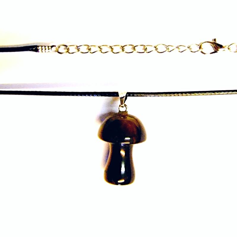 Gemstone Mushroom Pendant in Tigerseye with silver plated bail on a waxed cord with lobster style clasp.