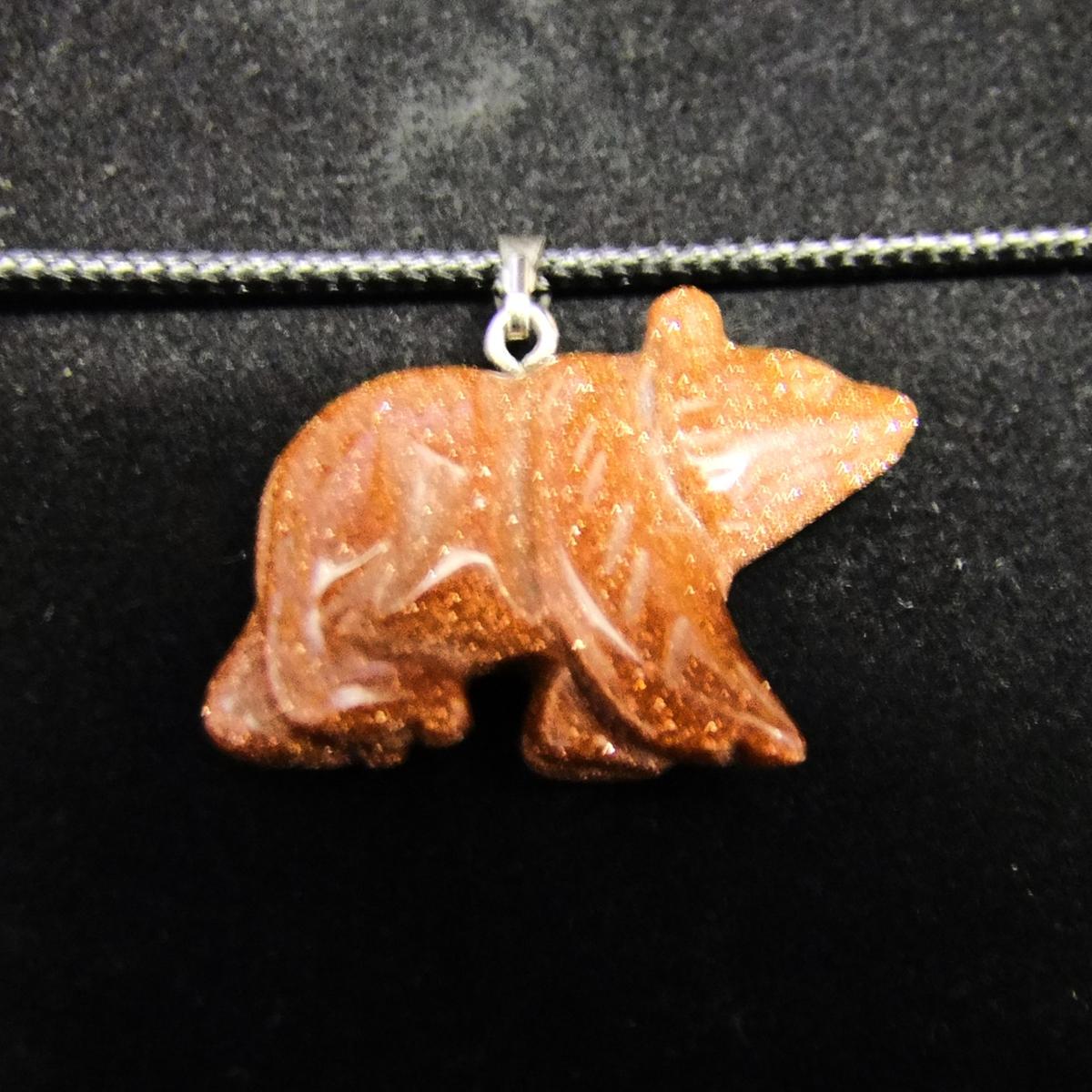 Gemstone & Waxed Cord Necklace Featuring A Carved Bear Pendant In Copper Goldstone.   SPR16093PEND