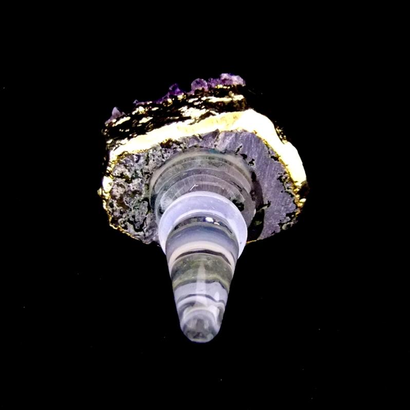 GLASS BOTTLE STOPPER WITH GOLD BANDED AMETHYST DRUZE TOP.