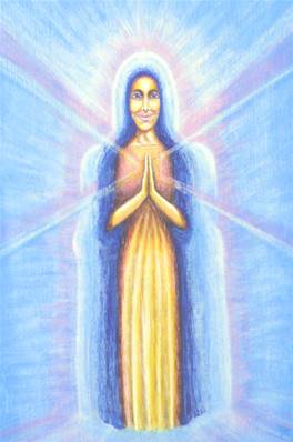 Healing Mother was inspired by visions of the Divine Mother over a period of five years. This is the second of three portraits depicting different aspects of her being. Here, she expresses sheer joy or bliss. Moreover, her compassion and all encompassing love for humanity shows in her eyes and in the aura surrounding her. The coloures emanating in her magnificent aura are all healing rays that relate to the body, mind emotions and the spirit of all sentient beings. The original was pained on wood using mixed media size 40cm x 27cm.