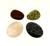 | SET OF FOUR MINI PALMSTONES IN RED JASPER, DALMATIAN JASPER, ROSE QUARTZ & SNOWFLAKE OBSIDIAN.