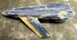 Kyanite is a striking aluminium silicate mineral, typically found in rich blue, though it can appear in green, black, or colourless varieties. Formed in high-pressure metamorphic rocks, its long, bladed crystals often display a unique silvery sheen. |