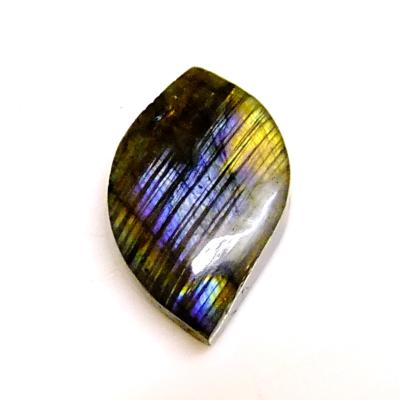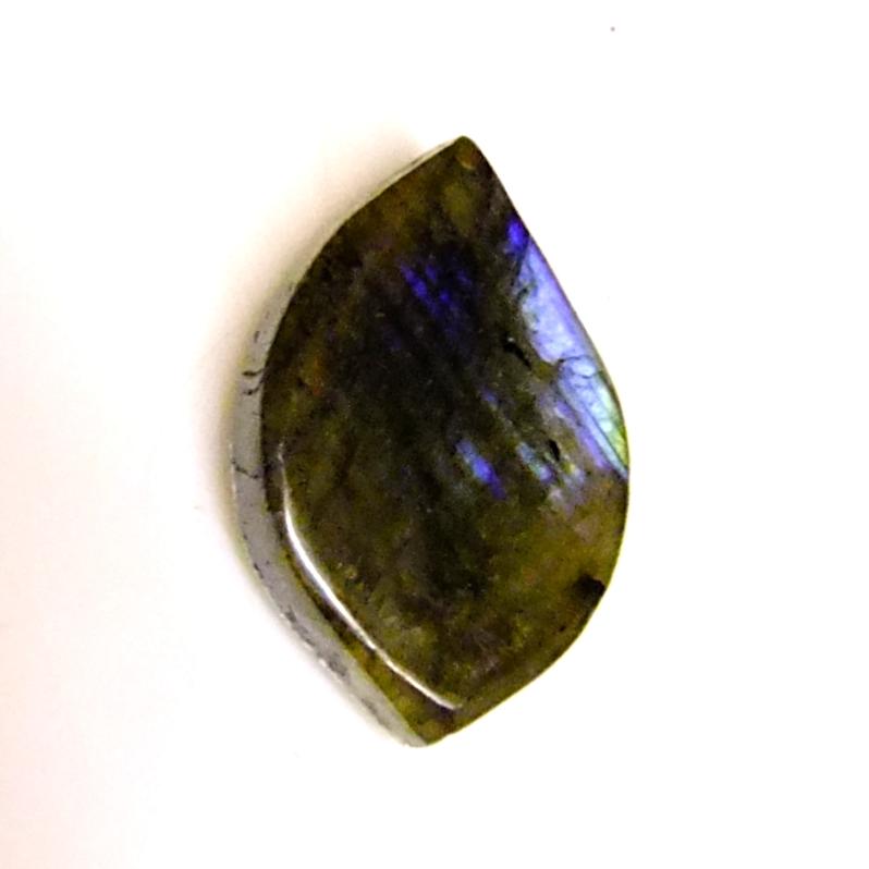 LABRADORITE POLISHED CABOCHON STONE IN CATS EYE SHAPE, ONE DOME POLISHED FACE WITH FLAT CUT BACK FACE.