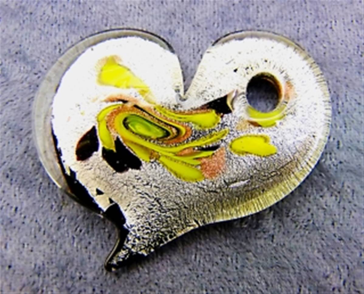 MURANO FLAT HEART PENDANT IN SILVER WITH COPPER GREEN SWIRLS.