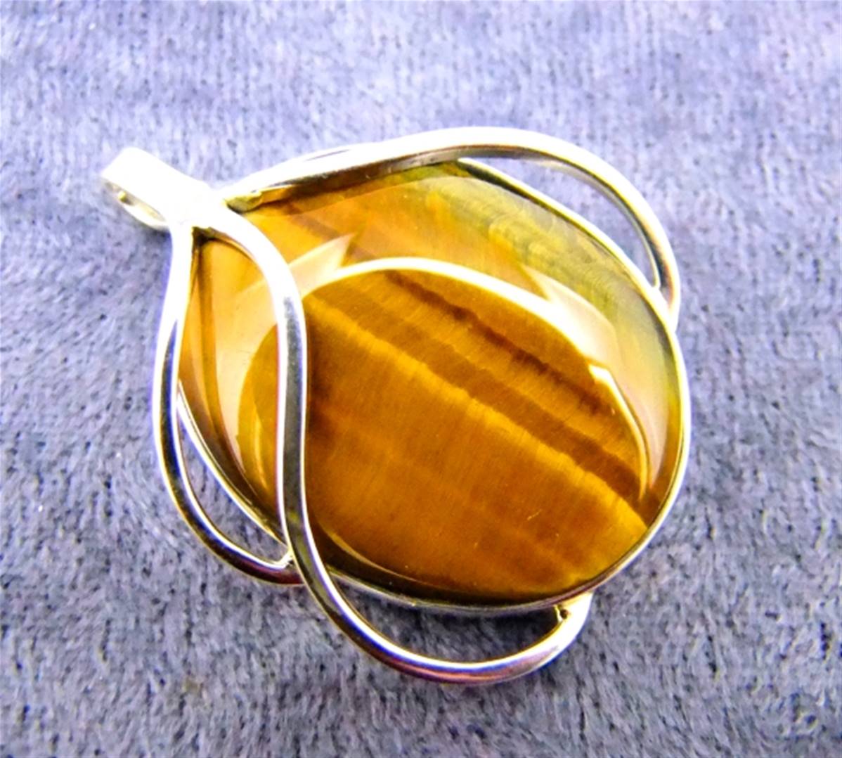 THIS PENDANT FEATURES A LARGE OVAL DOME POLISHED CABOCHON IN TIGERSEYE.