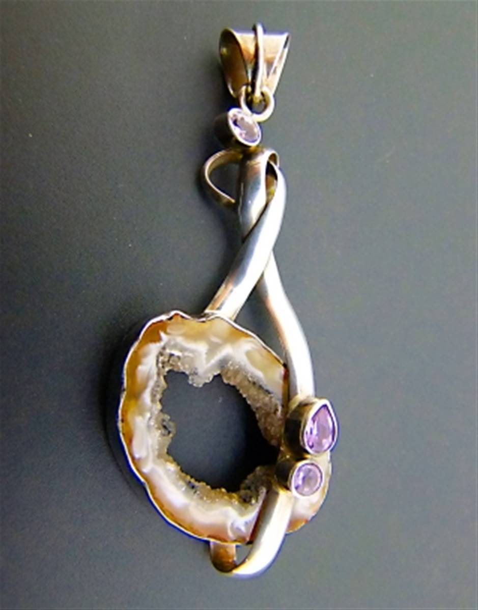 FEATURING A POLISHED FACE AGATE GEODE SECTION & ALSO ROUND, OVAL & TEARDROP SHAPE FACETTED CABOCHONS IN AMETHYST.