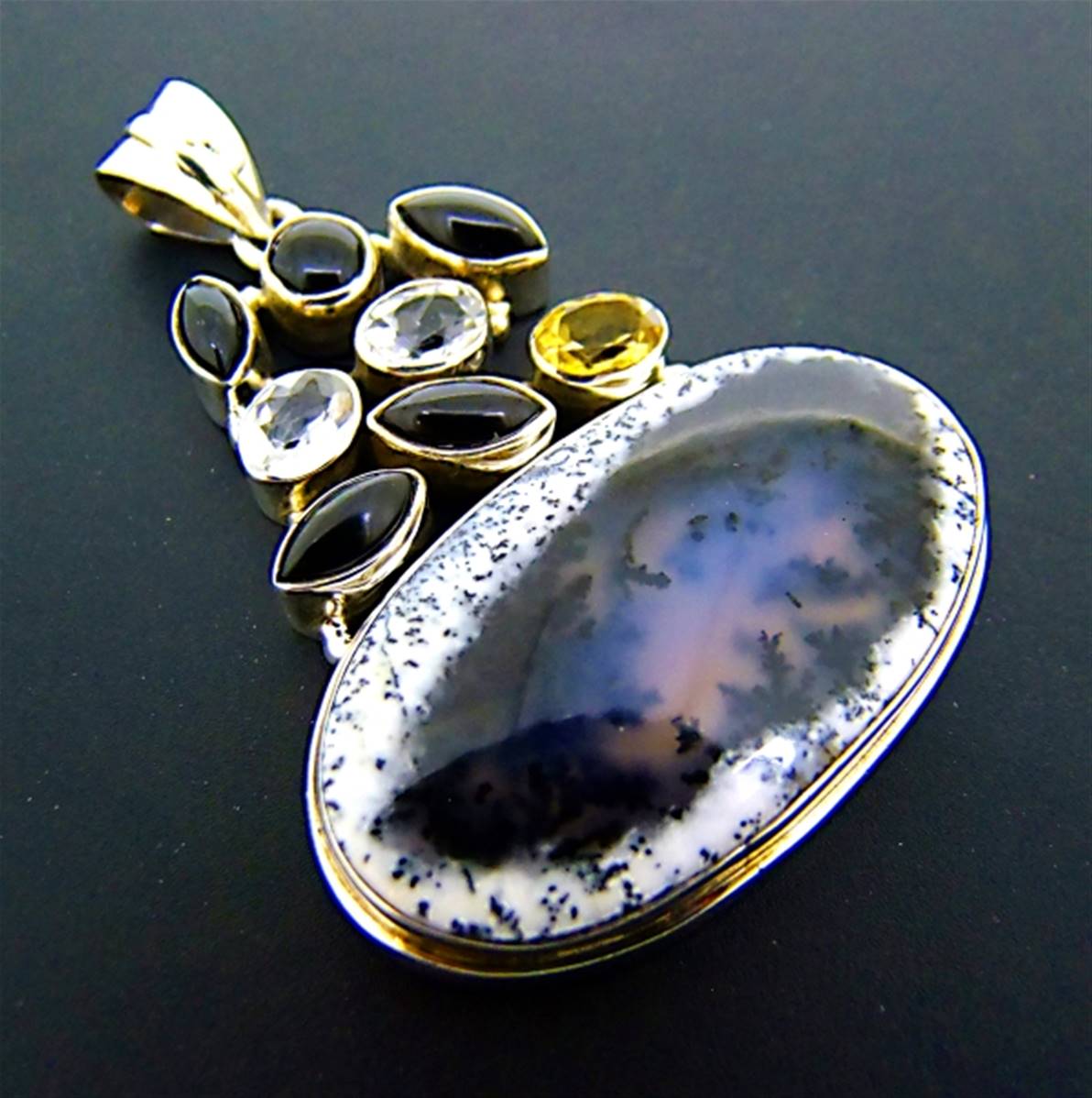 THIS PENDANT FEATURES A SINGLE LARGE OVAL DOME POLISHED CABOCHON IN MERLINITE TOGETHER WITH THREE SMALLER FACETTED OVAL CABOCHONS IN CITRINE & ROCK CRYSTAL. BLACK OBSIDIAN CATS EYE SHAPE & ROUND DOME POLISHED CABOCHONS ALSO ADORN THIS PENDANT.