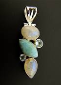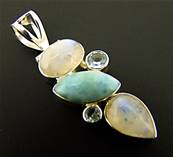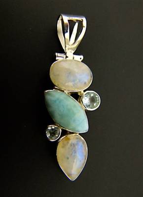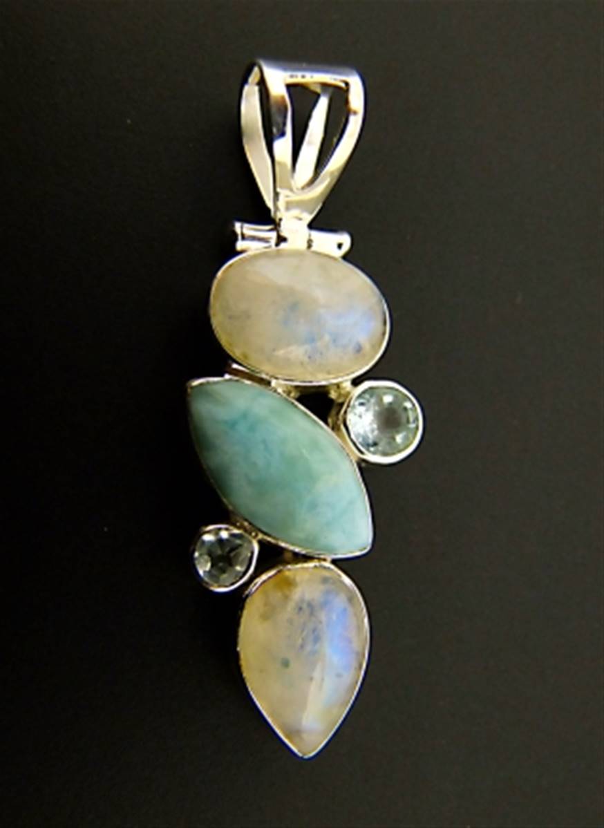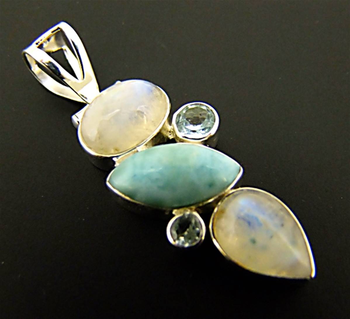 THIS PENDANT FEATURES DOME POLISHED CABOCHONS IN MOONSTONE & LARIMAR WITH SMALLER FACETTED CABOCHONS IN TOPAZ.