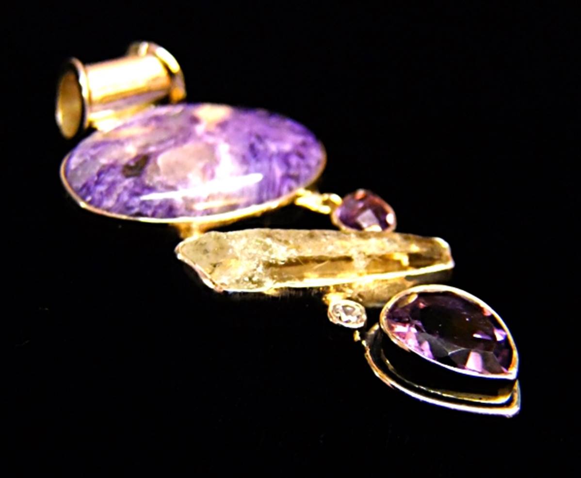 FEATURES A LARGE OVAL DOME POLISHED CABOCHON IN CHAROITE WITH FACETED TEARDROP SHAPE CABOCHONS IN AMETHYST TOGETHER WITH A ROUGH LEMURIAN QUARTZ CRYSTAL.