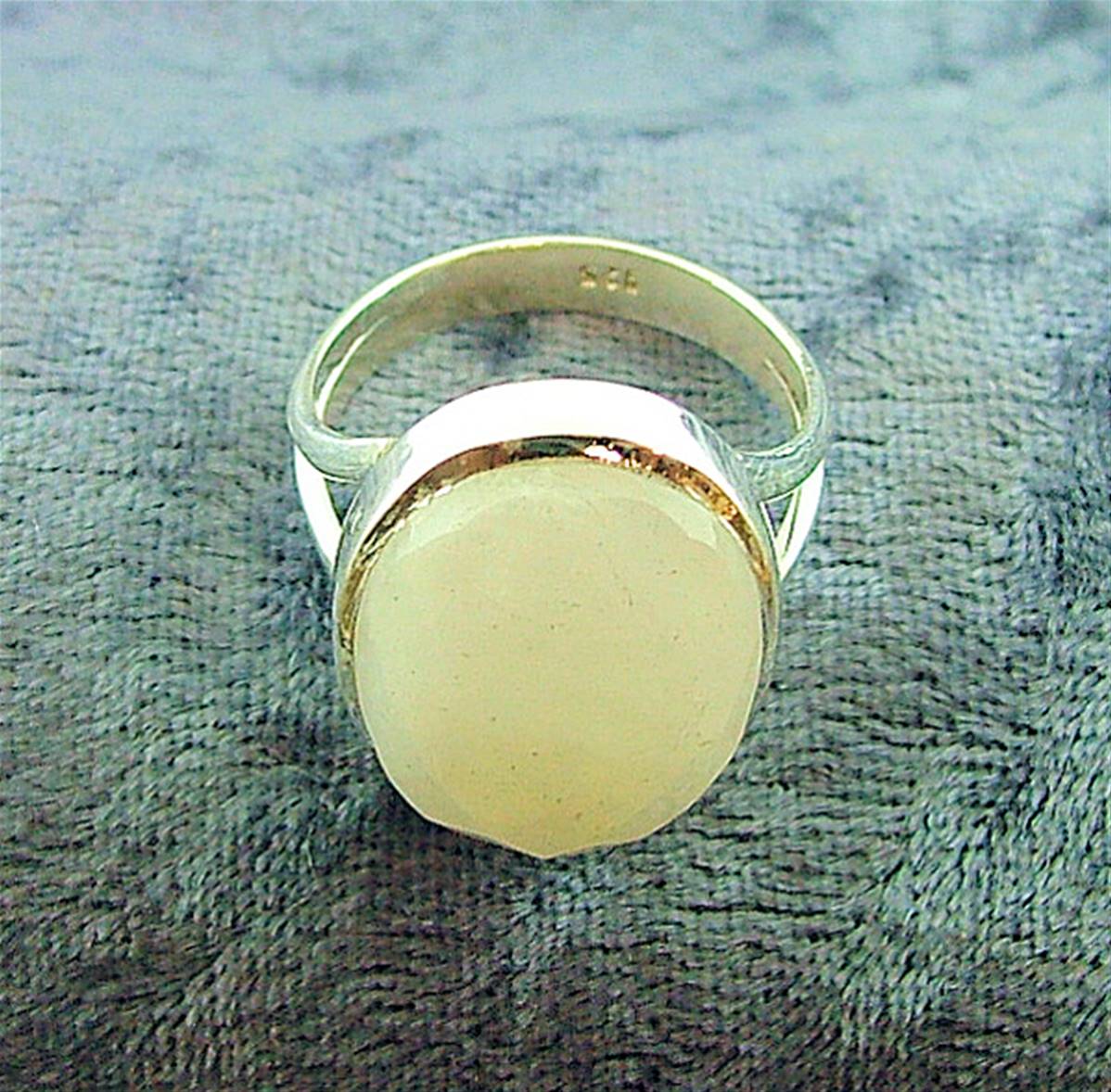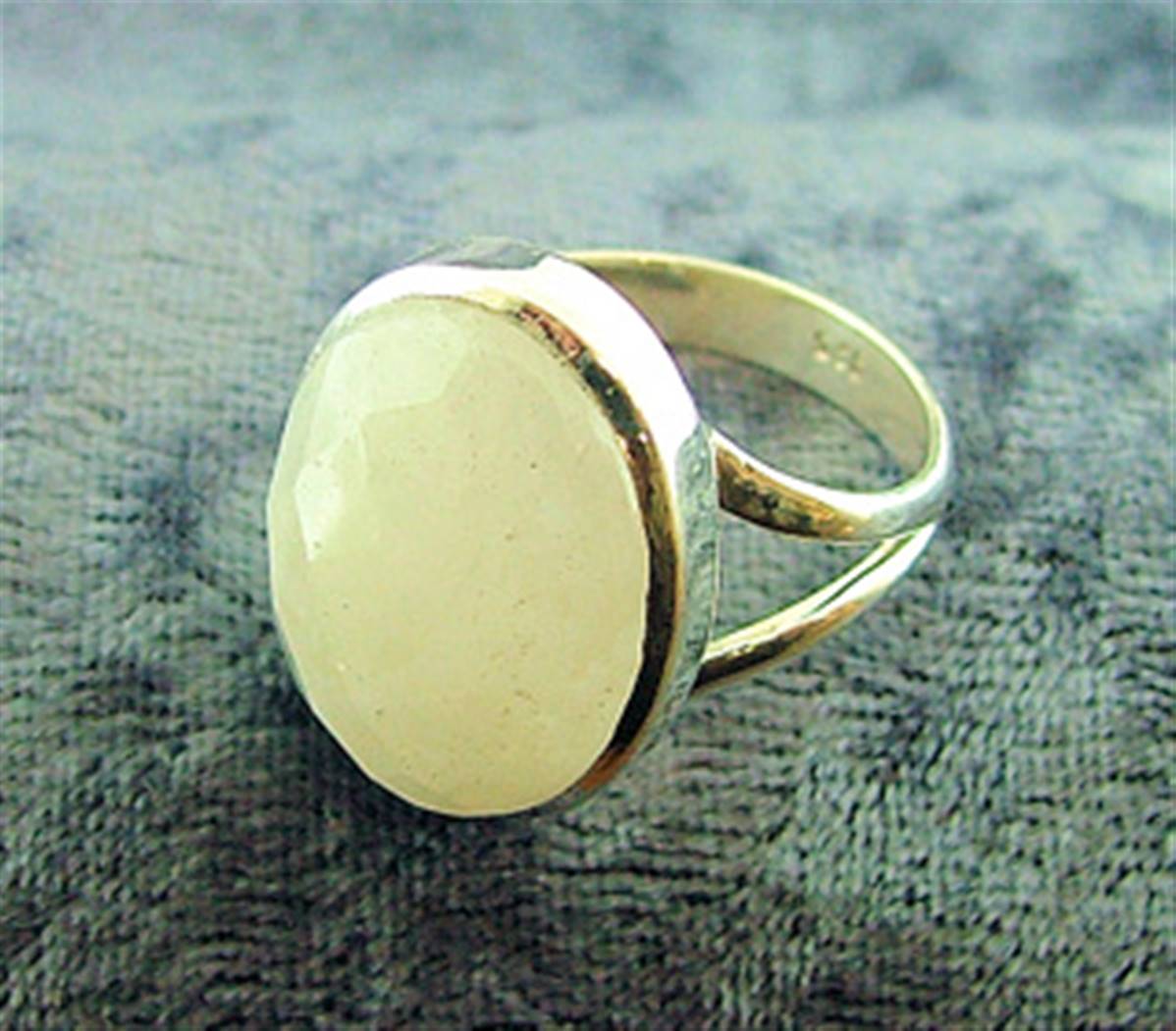 THIS RING FEATURES A SINGLE OVAL FACETED CABOCHON IN RAINBOW MOONSTONE SET IN A SILVER BAND.