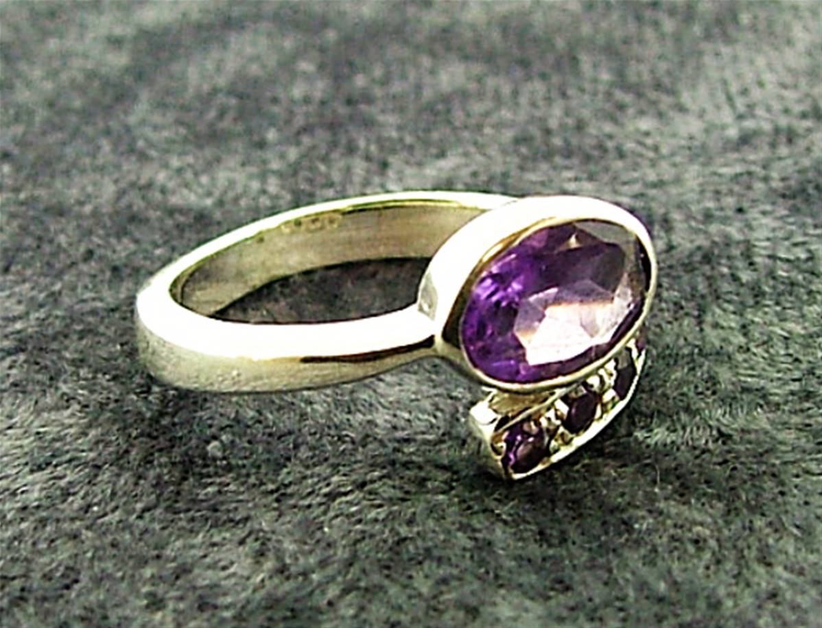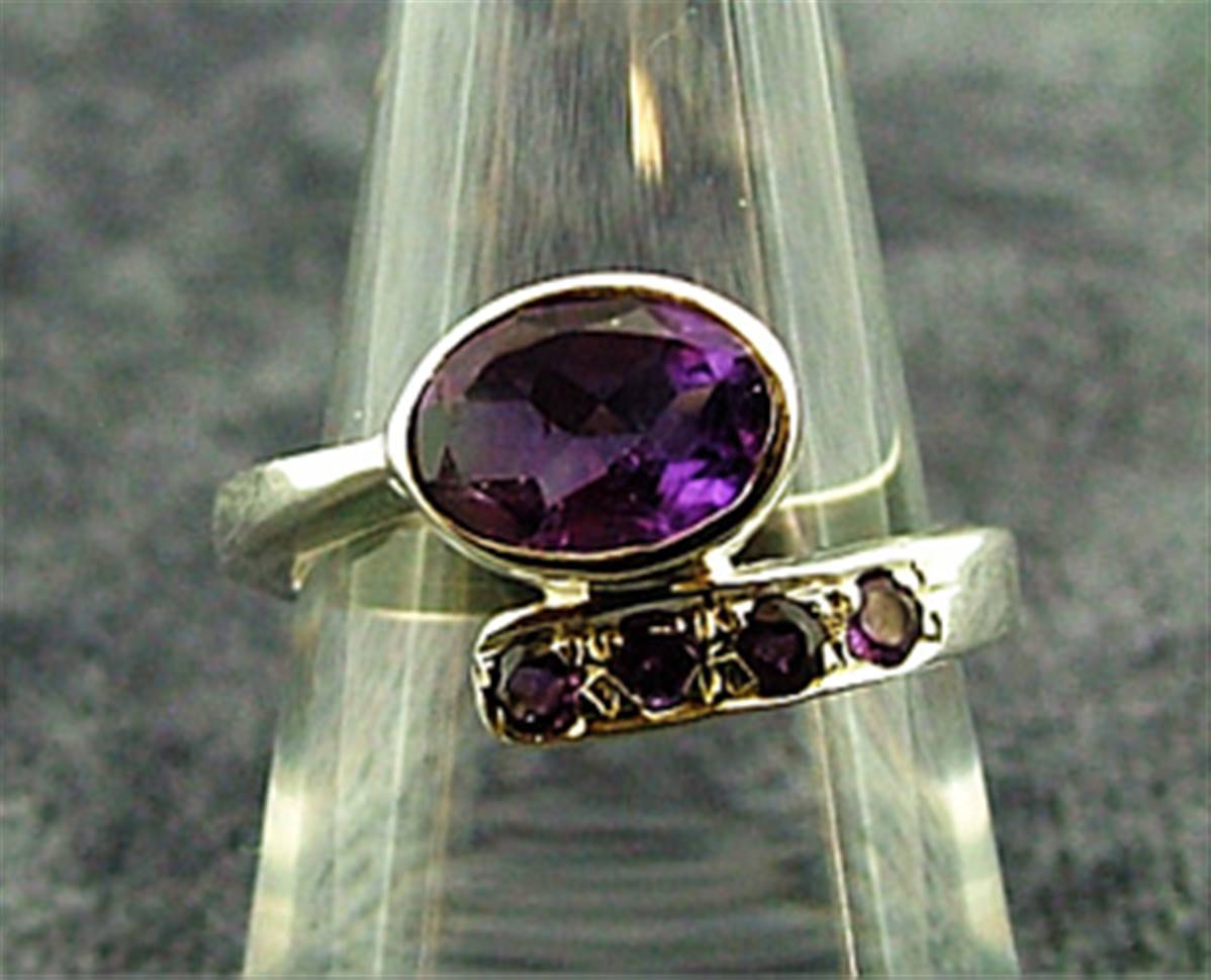 THIS RING FEATURES A LARGE FACETED OVAL SHAPE AMETHYST CABOCHON & FOUR SMALLER ROUND FACETED AMETHYST CABOCHONS.