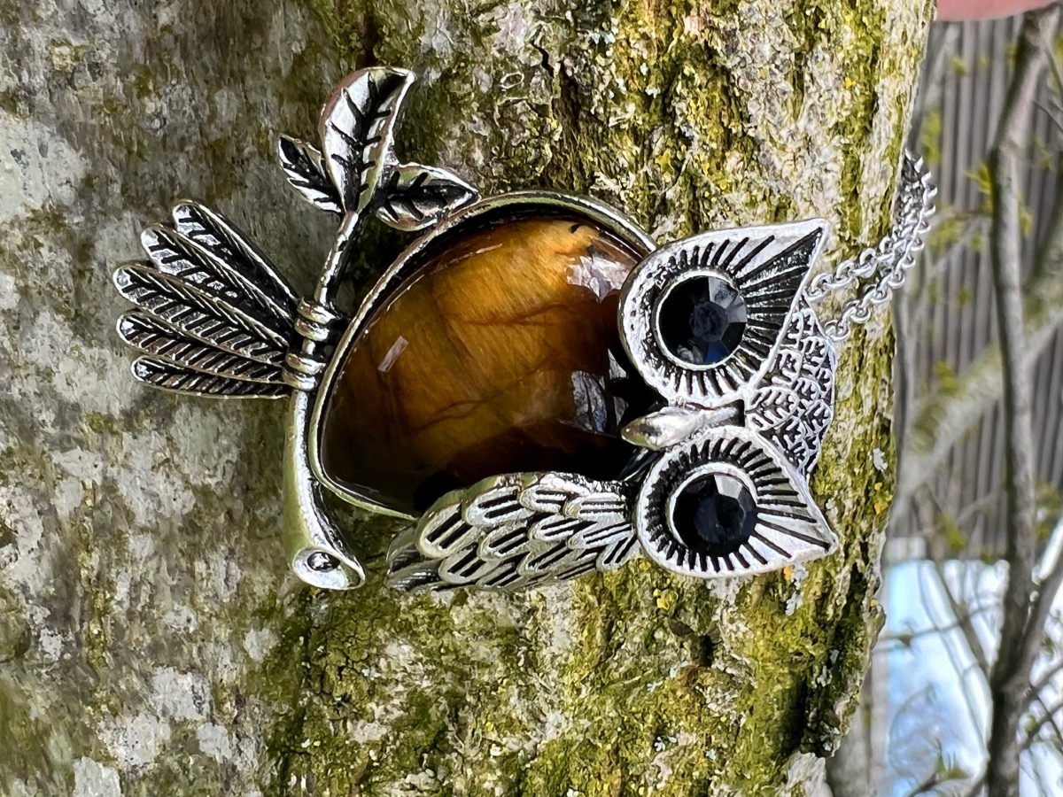 Owl pendant set with a Gemstone Body of Tigers Eye inset with faceted eyes. owl 6