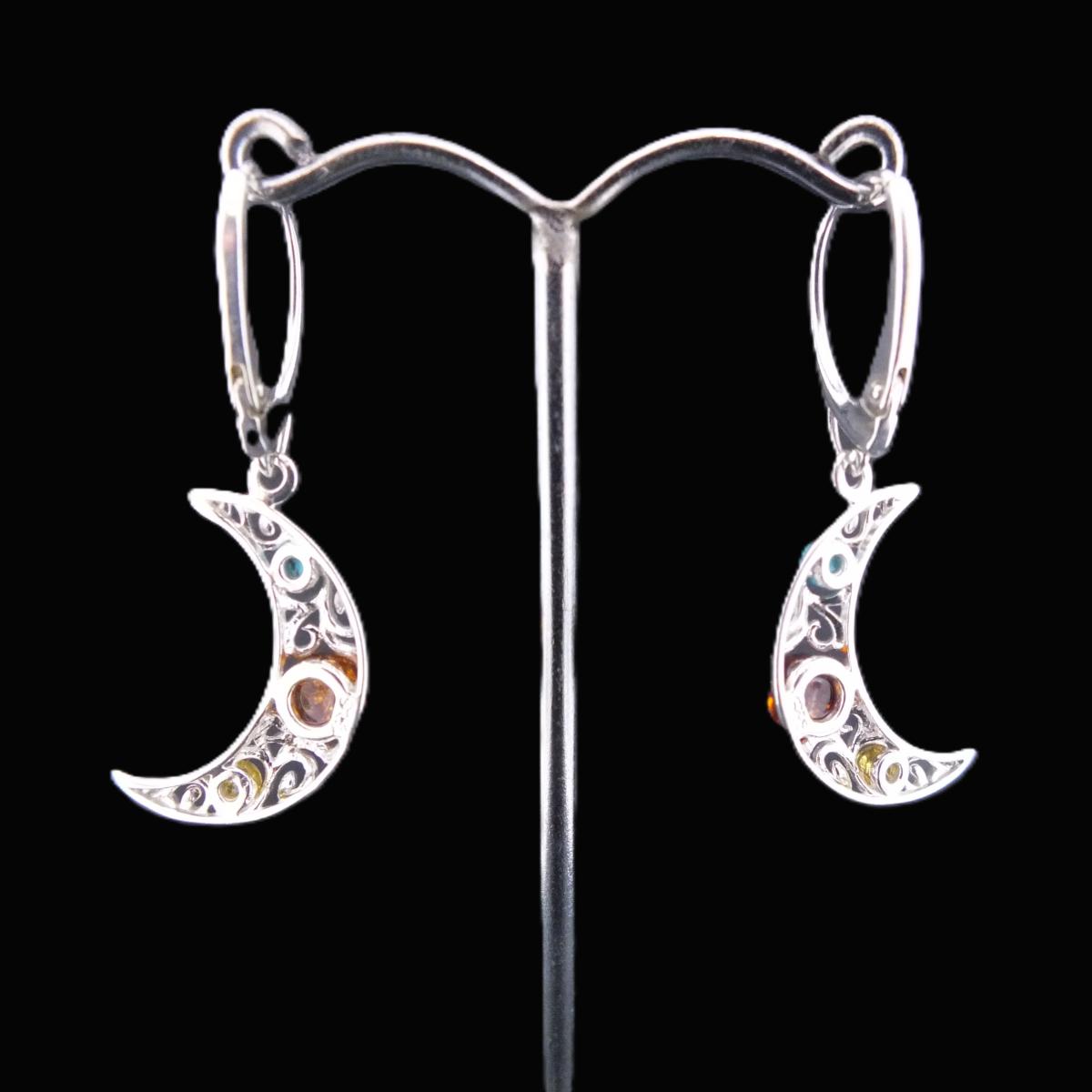 • Pair Of Crescent Moon Filegree Style Pendant Earrings With Turquoise And Amber Cabochons.   SP17293ER