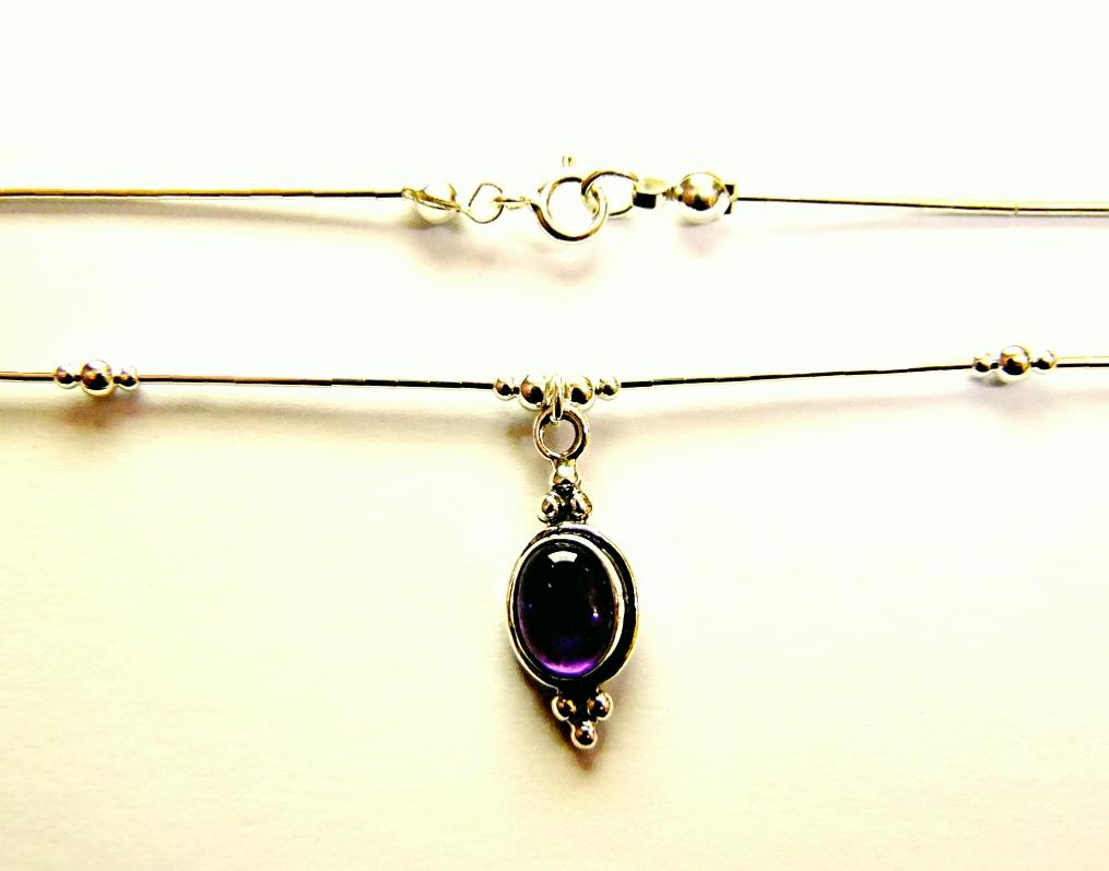PENDANT NECKLACE IN 925 SILVER FEATURING A DOME POLISHED OVAL CABOCHON IN AMETHYST WITH SILVER BEADS AND TRIGGER STYLE CLASP.