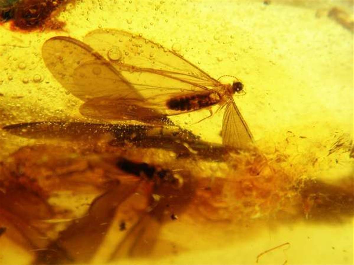 • POLISHED COLUMBIAN COPAL SPECIMEN DISPLAYING INSECT INCLUSIONS.