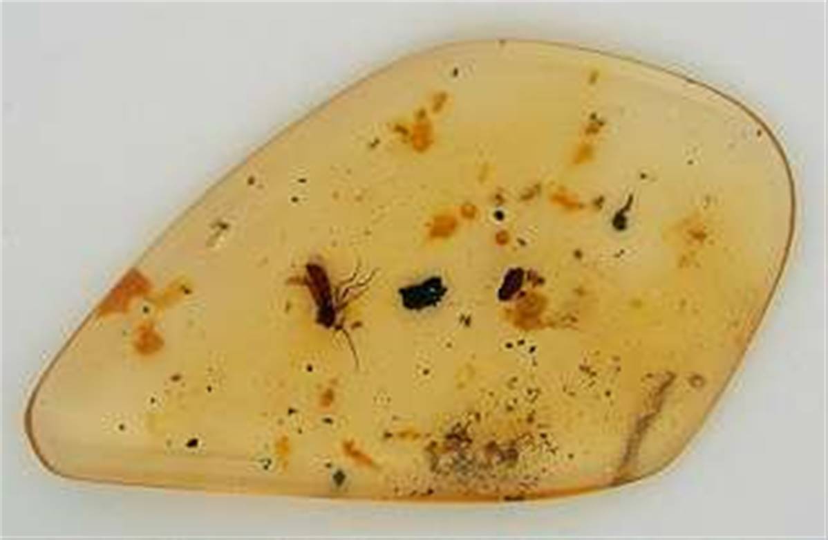 • POLISHED COLUMBIAN COPAL SPECIMEN DISPLAYING INSECT INCLUSIONS.