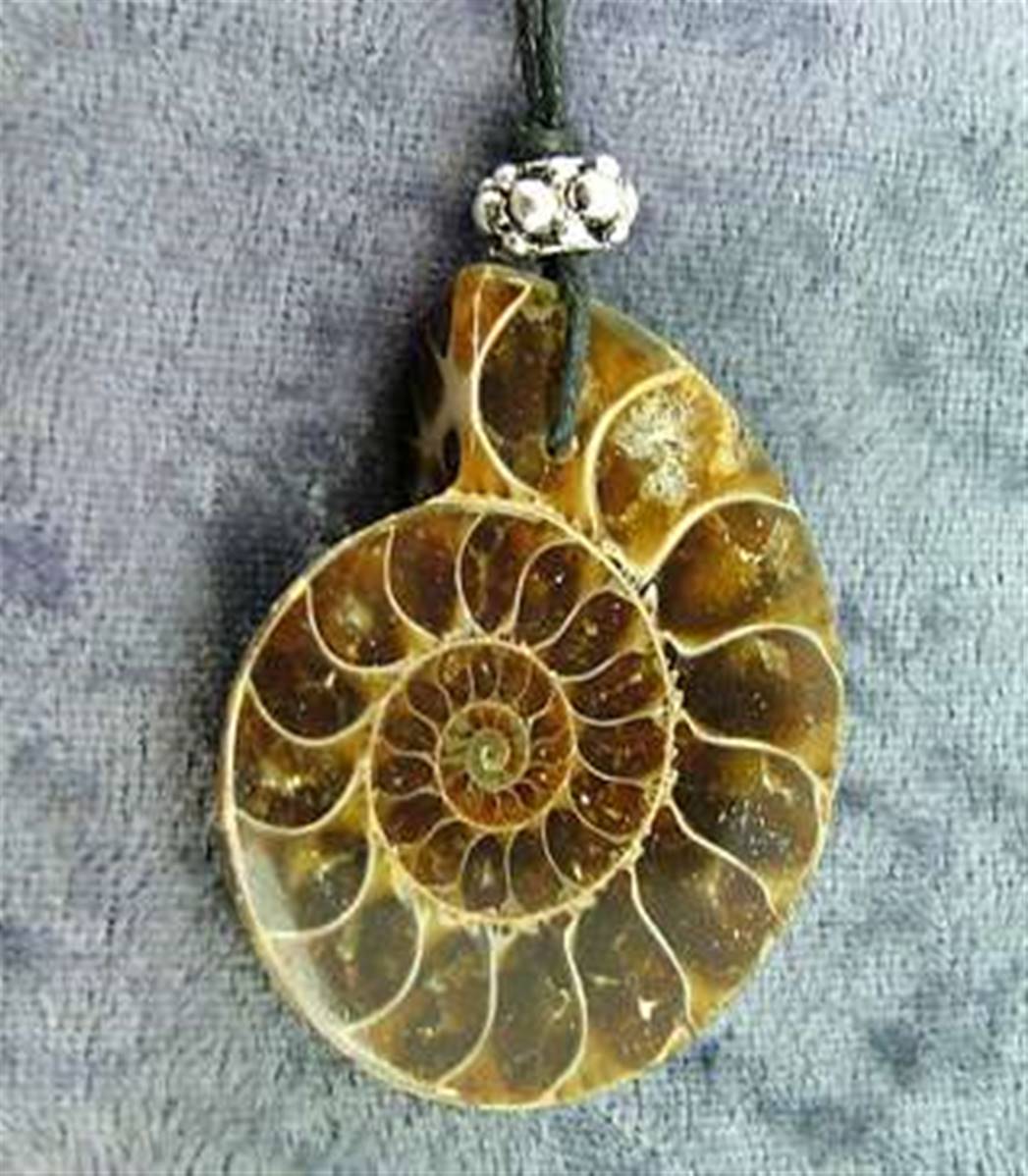 THIS PENDANT FEATURES A CUT AND POLISHED HALF OF A FOSSILISED AMMONITE.