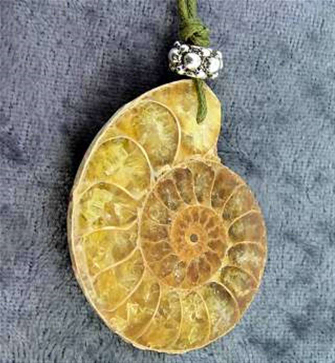 THIS PENDANT FEATURES A CUT AND POLISHED HALF OF A FOSSILISED AMMONITE.