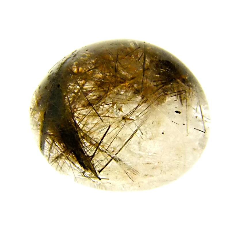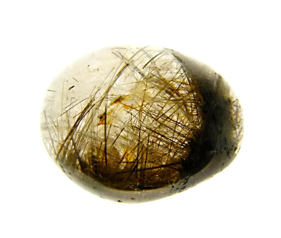 QUARTZ DOME POLISHED PEBBLE SPECIMEN FEATURING GOLDEN RUTILE INCLUSIONS.