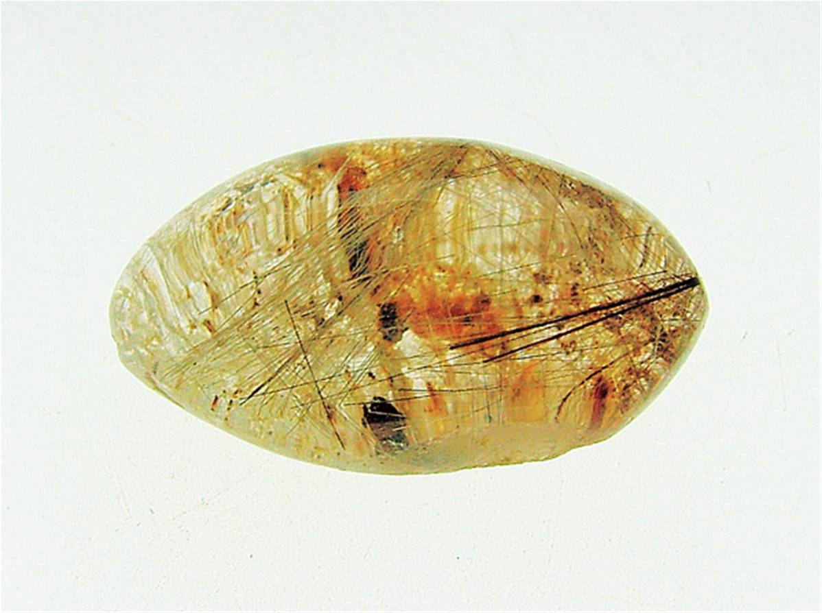 SPECIMEN FEATURES RED RUTILE INCLUSIONS.