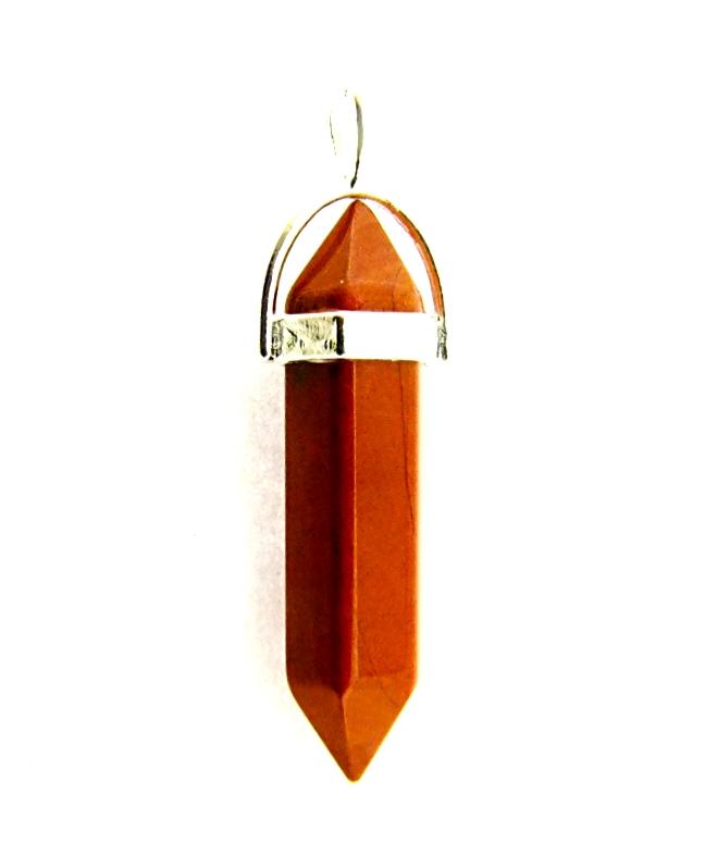 RED JASPER DOUBLE TERMINATED HEALING POINT PENDANT FEATURING A SILVER PLATED BAIL.