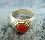 | THIS RING FEATURES A SINGLE ROUND CABOCHON IN CARNELIAN EDGED WITH 14CT GOLD DETAILING SET IN A SILVER HAMMERED BAND. RING SIZE = M+ WIDTH OF BAND = 10MM OVER ALL. SIZE OF CABOCHON = 9MM IN DIAMETER. WEIGHT = 8g. |