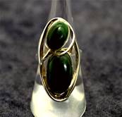 | | THIS RING FEATURES TWO OVAL CUT DOME POLISHED CABOCHONS IN MALACHITE. RING SIZE = M SIZE OF CABOCHONS = 12MM X 7MM & 17MM X 10MM. WEIGHT = 9g.