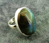 | | THIS RING FEATURES A SINGLE LARGE OVAL CABOCHON IN LABRADORITE. RING SIZE = L SIZE OF CABOCHON = 26MM X 18MM. WEIGHT = 15g. |