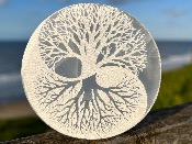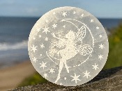 | | SELENITE / SATIN SPAR ROUND MANDALA ETCHED CHARGING PLATE.