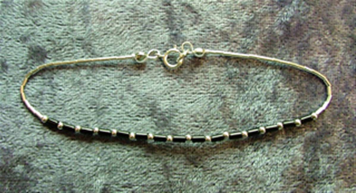 THIS BRACELET IN 925 SILVER FEATURES ROUND BEADS IN SILVER AND TUBULAR BEADS IN BLACK ONYX ALSO FEATURES A TRIGGER STYLE CLASP.