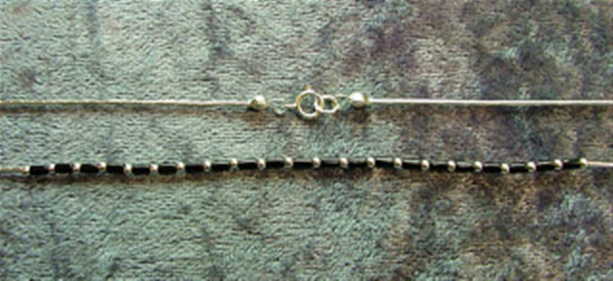THIS NECKLACE IN 925 SILVER FEATURES ROUND BEADS IN SILVER AND TUBULAR BEADS IN BLACK ONYX ALSO FEATURES A TRIGGER STYLE CLASP.