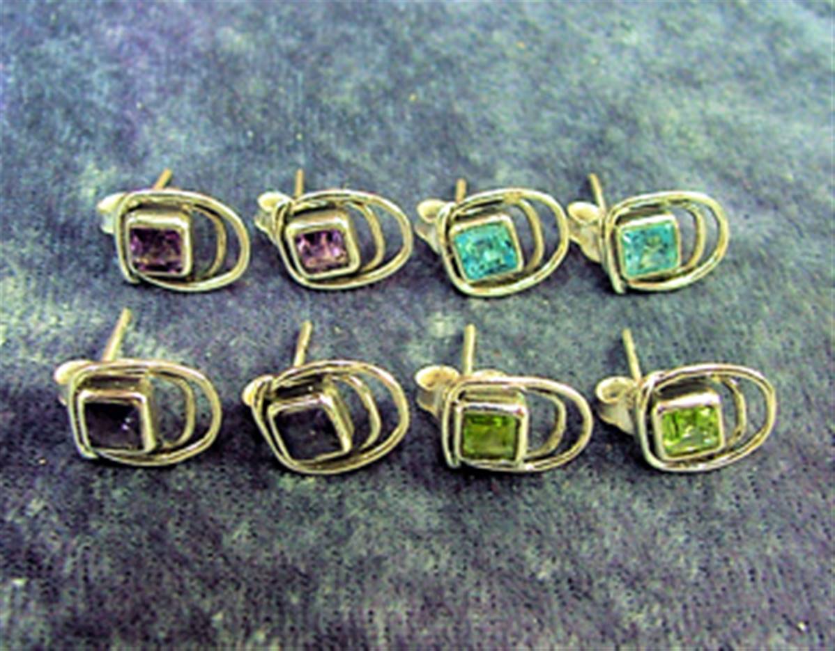 FEATURES A FACETED SQUARE CUT CABOCHON IN EITHER AMETHYST, BLUE TOPAZ, IOLITE OR PERIDOT.