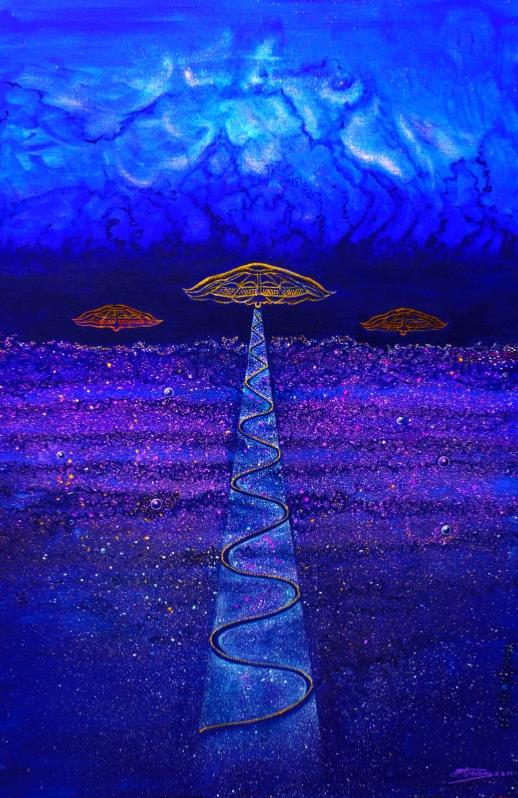 When unhappy as a child I would go for a walk and look up at the night sky and talk to the stars knowing that they understood my troubles. Now as an adult in my mid seventies I am convinced that we are not alone in the universe. The three golden visitors are depicted on a mission to observe the expansion of the universe and the largest of these generates a lifeline that could be linked to manner from heaven for those open to receive the subtle mystical properties, which help to raise our consciousness and inspire us to develop a greater understanding of why we are here. These golden vehicles are not fabricated from metals or materials, but are formed by the cosmic minds of beings that may be likened to angels.