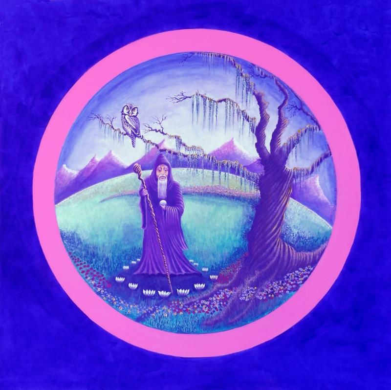The Hermit & the Owl is concerned with mankinds relationship with the planet, which most of us are aware is in crisis. Here, the Hermit is at one with nature and the planet to such a high degree that he is able to commune with both the trees and all the animals in the wild. The Hermit sees the owl as a little brother, and the creature also symbolises the hermit's ability to allow his sprit to ascend to the heights at will. People come to see the Hermit to be healed of their woes and sickness. his home is the mountains above where he resides in a cave.