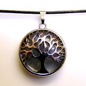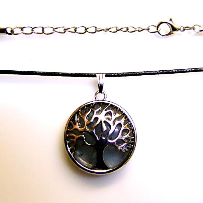 Tree of Life pendant style necklace with Fluorite Cabochon in silver plated setting with waxed cord featuring a lobster style clasp.