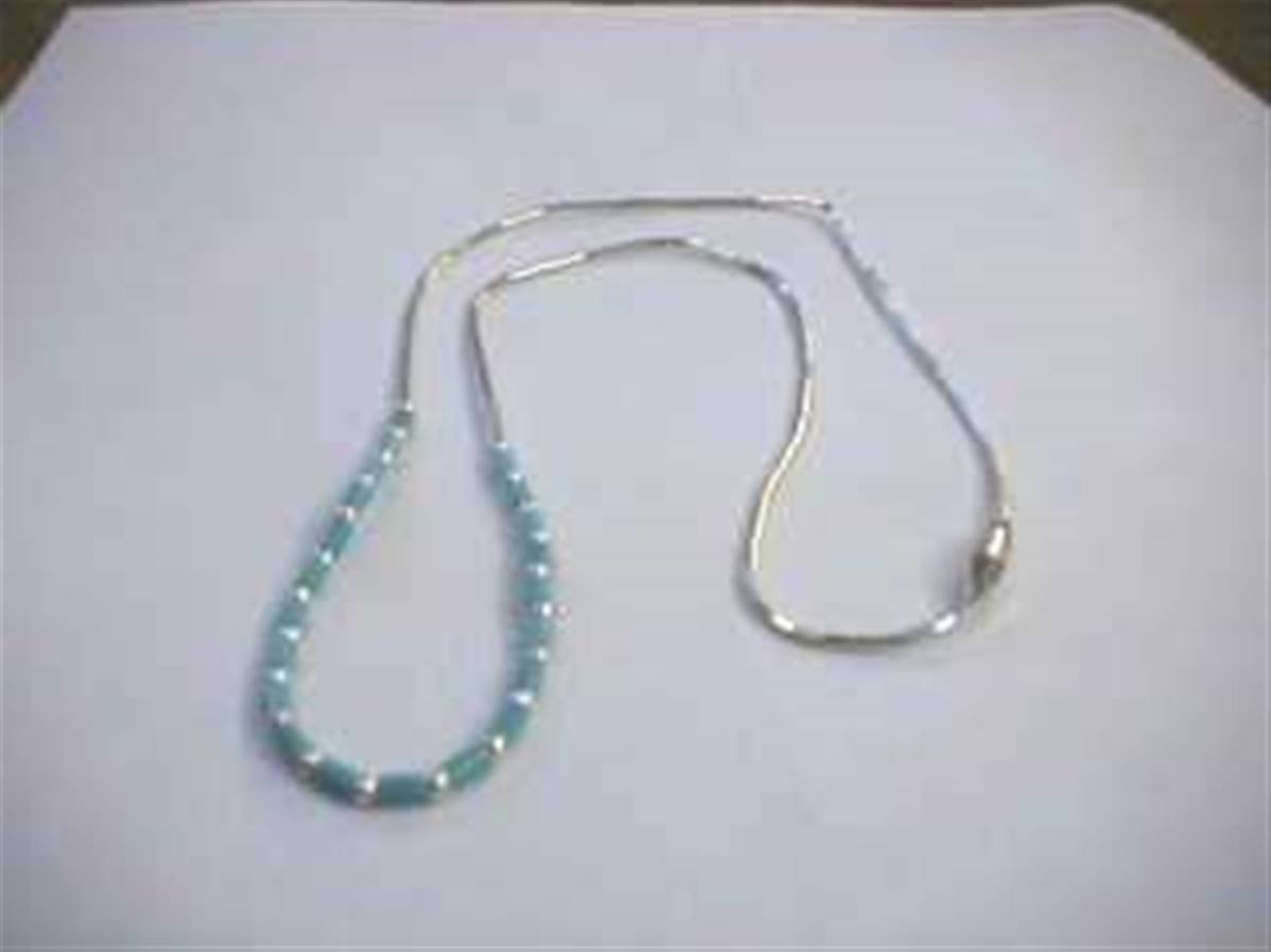 This delightfully simple necklace is constructed by tiny sterling silver tubes threaded on to beading wire, interspersed with silver beads and turquoise. Length of necklace appx 18 inches.