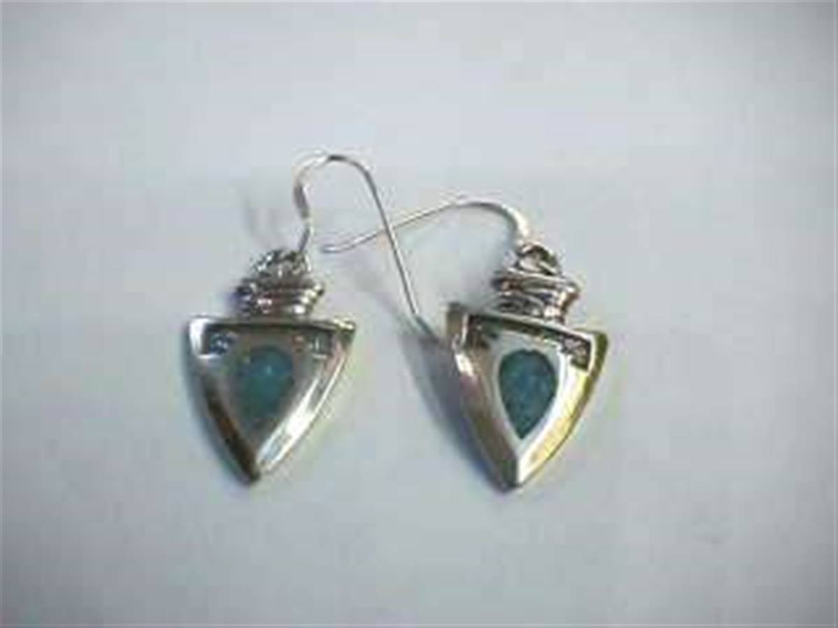 Unusual earrings crafted from sterling silver and turquoise in the style of a native American Indian arrowhead.