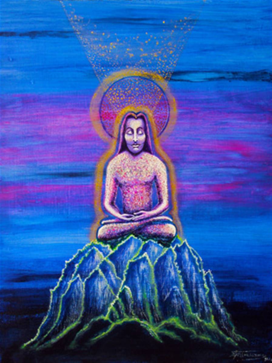 This image came to the artist during morning meditation. This figure depicts the yogic pracititioner undergoing a mystical transformation as he absorbs the inflow of cosmic energy into his being. His aura is transformed as his ego mind dissolves and he experiences bliss and the all encompassing unconditional love that is the essence of the cosmos. It shows how all negative impulses and karma can be transmuted into pure unadulterated energy that is the !!<>!!!!<>!!stuff!!<>!!!!<>!! of the universe. This ultimate compassion is then generated out into the world automatically for the benefit of all sentient beings. People that have seen this painting commented that they found it calmed their minds and triggered a meditative state.